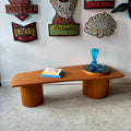 This Mid-Century RS Associates Teak Martini Coffee Table features a beautifully shaped teak top with a warm, flowing grain and an asymmetrical silhouette that adds movement to your space. It’s supported by two cylindrical pedestal bases, giving the piece bold architectural presence.